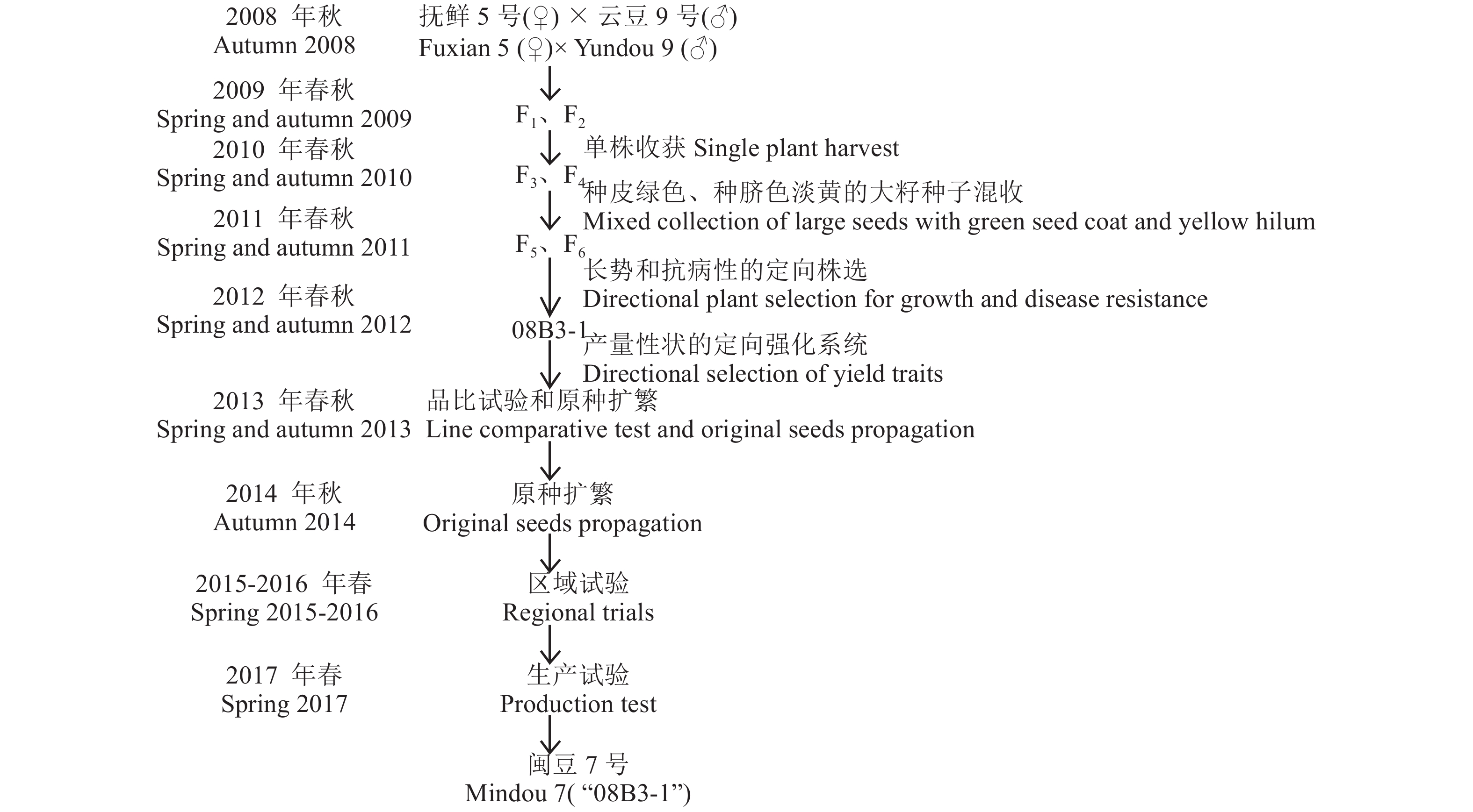 Method Hybridized by using Fuxian 5 as the female parent and Yundou 9 as the male parent, a pedigree line coded 08B3-1 was generated. In the spring of 2013 trial, the newly bred variety demonstrated yield traits and bean quality significantly higher than those of the reference, Maodou 3. It was then named Mindou 7 and submitted for demonstration in the annual regional trials in the province on new soybean varieties for fresh bean consumption.
